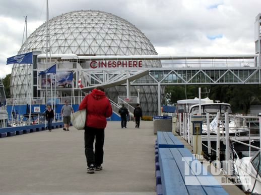 Approaching the Cinesphere from a walkway at the marina …