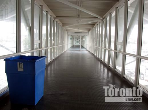 Inside one of the long enclosed walkways leading to the pavilions