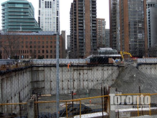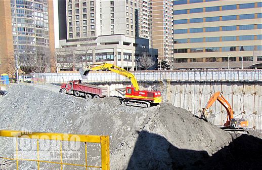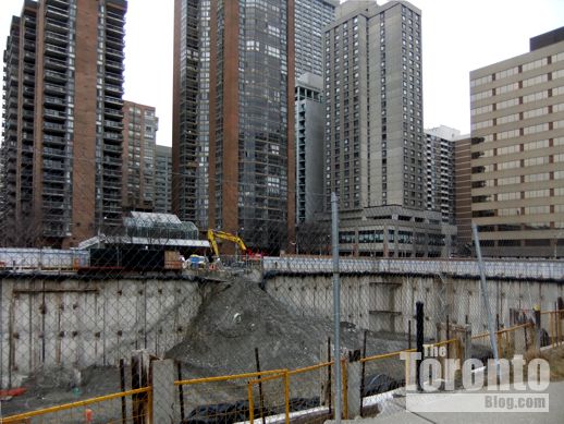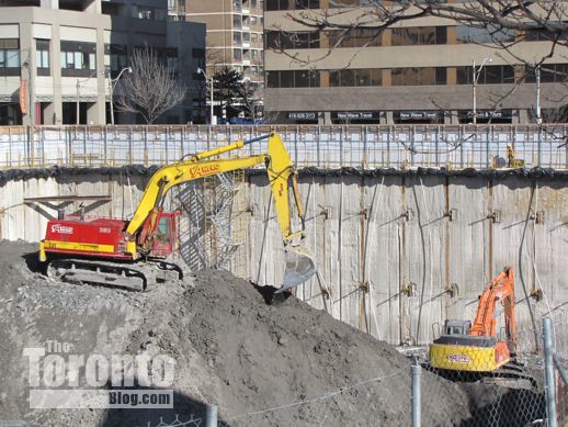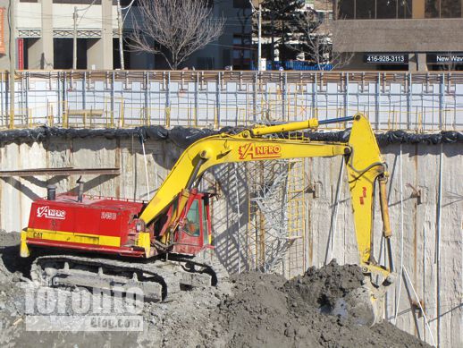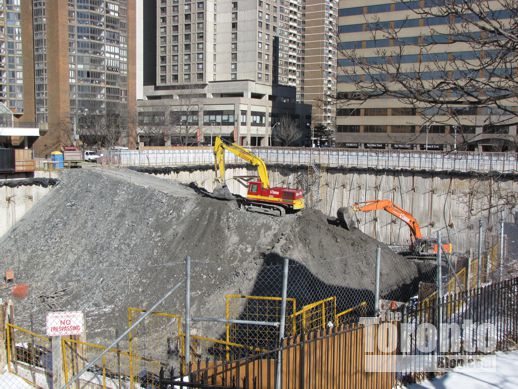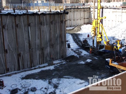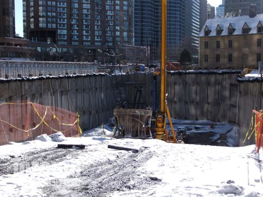 January 21 2012: A view from Bay Street of a foundation drilling machine in the U Condos excavation. The 50-storey east tower will rise in the foreground, while the 45-storey west tower will rise in the pit section visible toward the upper right corner of the photo.