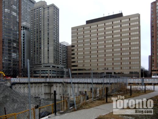 March 2 2012: Looking toward the northwest corner of the site. The brown brick building is the Loretto College women’s residence at 70 St Mary Street. It’s part of University of St. Michael’s College at the University of Toronto.
