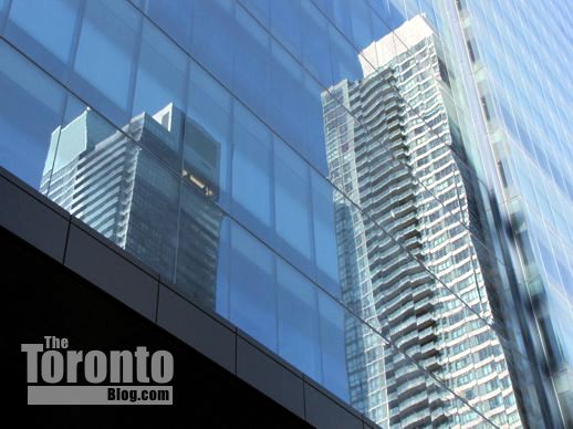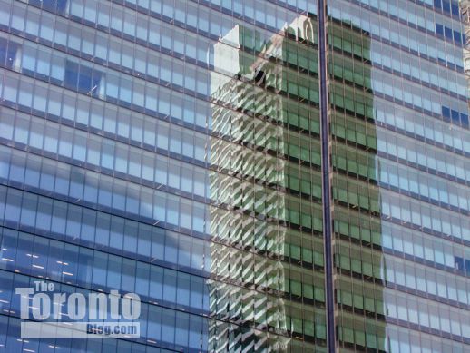 March 7 2012: One of the two condo buildings at nearby Maple Leaf Square reflects on the south glass face of the PwC Tower
