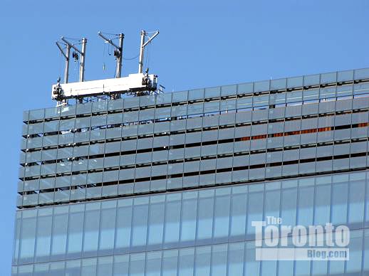 February 20 2012: A swing stage rises above the upper left corner of the PwC Tower’s south face, where the trademark PwC logo will be affixed