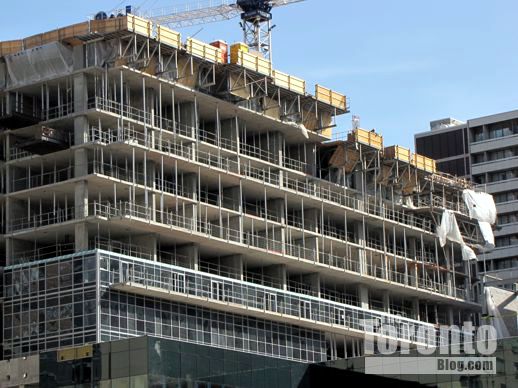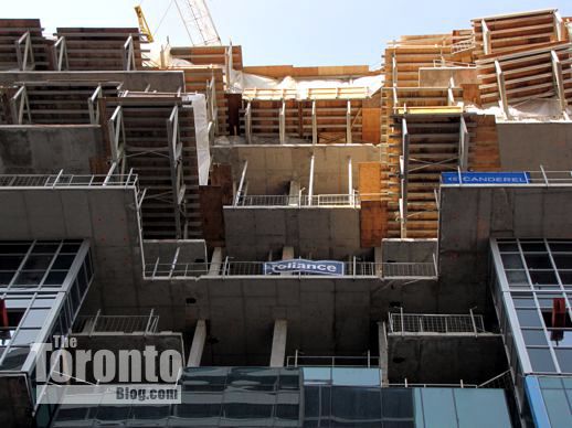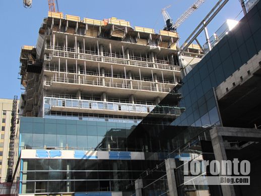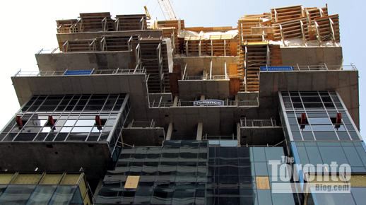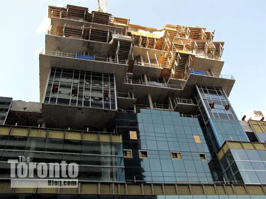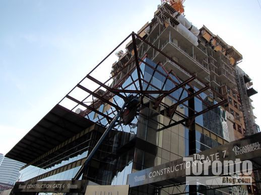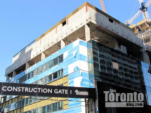 March 6 2012: Cladding and more overhang supports near the southwest corner of the tower base above Gerrard Street