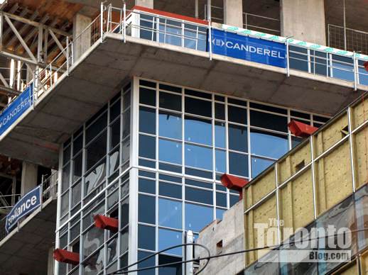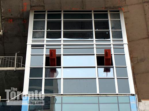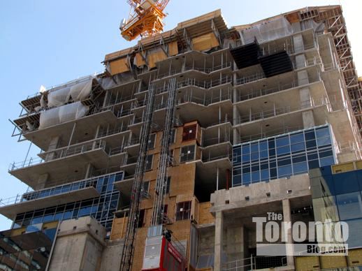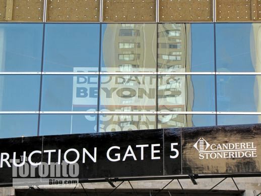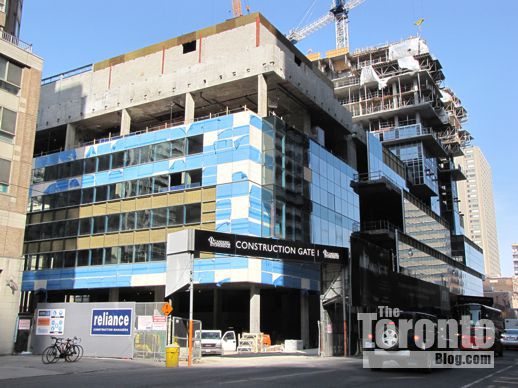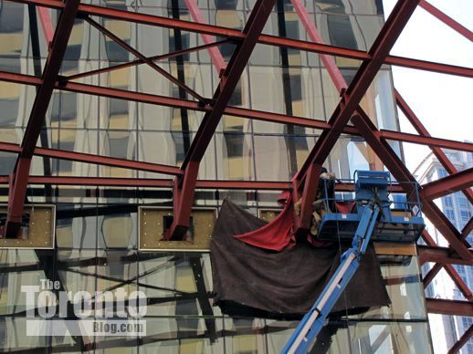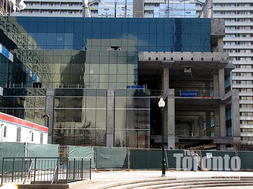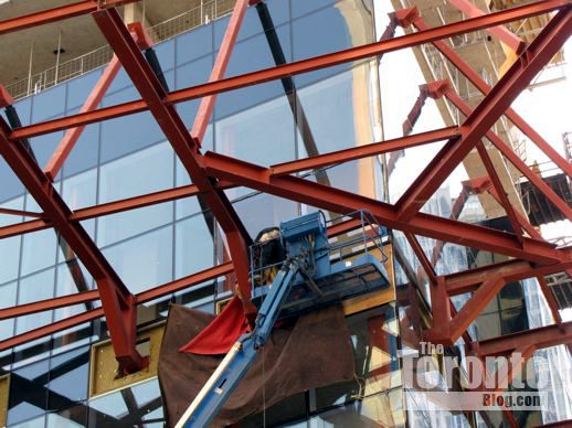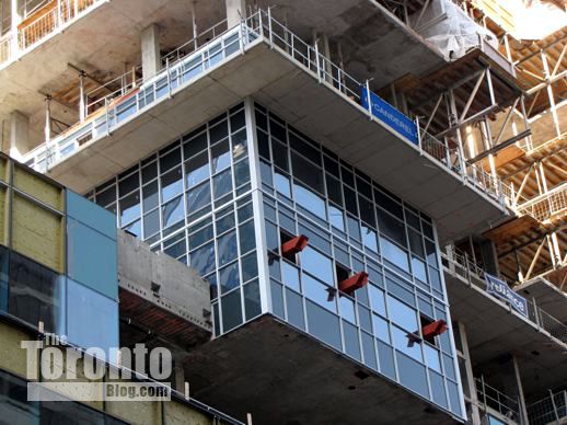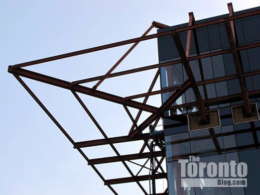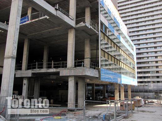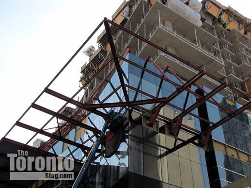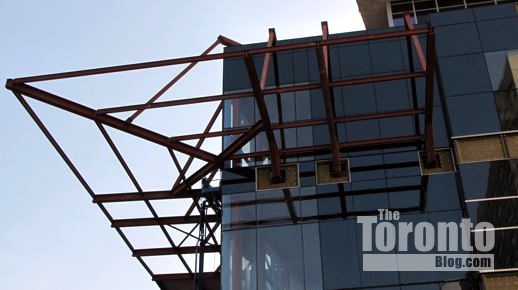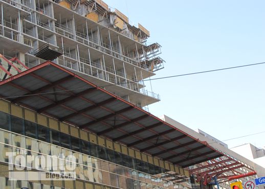 March 6 2012: Steel beams poke through cladding on the building’s south side; they’ll hold up the protective overhang that will be installed above Gerrard Street