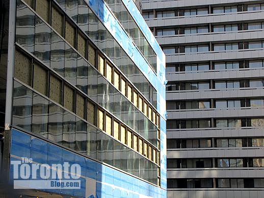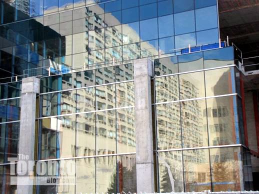 March 6 2012 An office building on the east side of Yonge Street reflects in the glass cladding of Aura’s podium