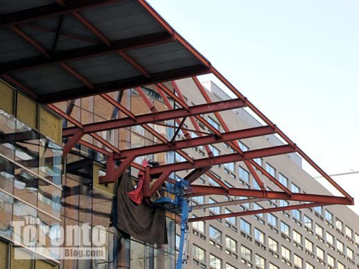 March 6 2012: The northeast corner of the frame being built to hold the protective canopy above the Yonge Street sidewalk