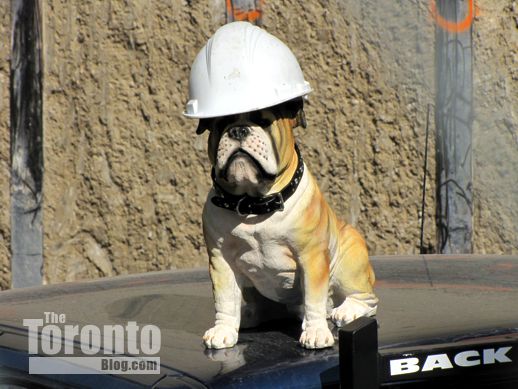 While I was shooting the pooch’s picture through a security fence on the west side of the site, several passersby came over to see what had caught my attention. Within moments, half a dozen people were pressing cellphones against the chainlink fence, snapping their own pics of the catatonic canine. Some actually thought the dog was real, including one woman who exclaimed : “Oh, he’s so cute … but how does he manage to keep that helmet on his head?” One fellow started intently through the fence and said: “I think it’s fake. It can’t be real. I don’t think they’re allowed to bring pets to construction sites.” Another said to me: “That’s hilarious. It’s great to see these guys have a good sense of humour. They’ve got a rough job.” Or did he mean “ruff”?