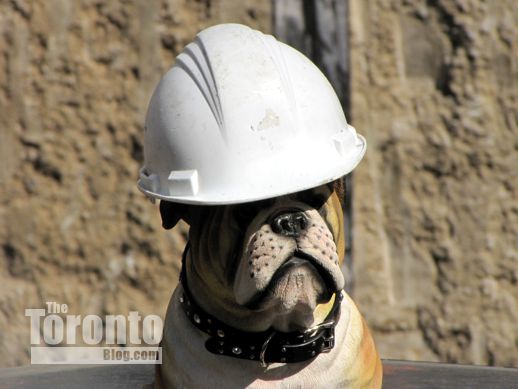 Bulldog boss: I’ve occasionally seen dogs doing security duty at construction sites, but today marked the first time I’ve seen one wearing a white hardhat and supervising the humans working on an excavation for a condo tower project.