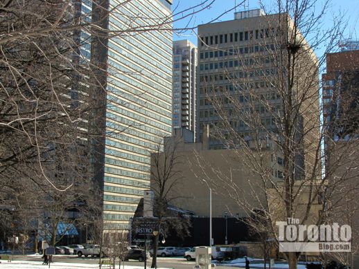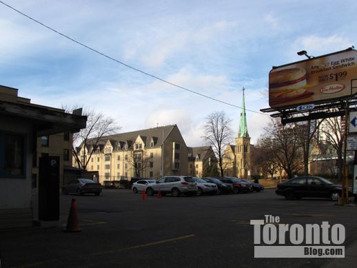 January 21 2012: Looking west across the 1000 Bay parking lot toward the University of Toronto campus, including the Cardinal Flahiff building right next door at 95 St Joseph Street (rear)