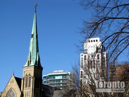January 9 2012: The condo tower will overlook buildings on the University of Toronto campus across St Joseph Street, including St Basil’s Church