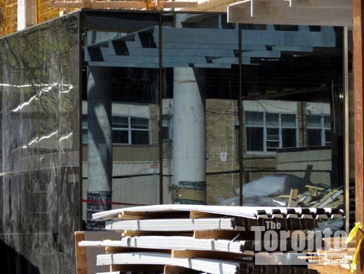 April 27 2012: Glass cladding on the southwest corner reflects columns near the building’s southeast corner on Isabella Street