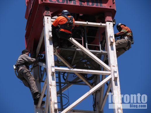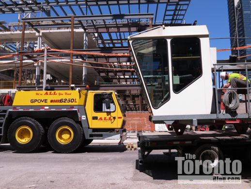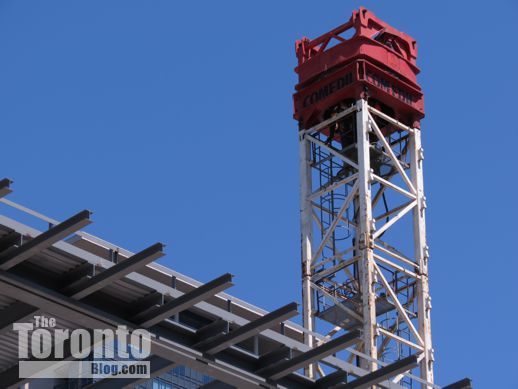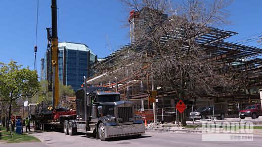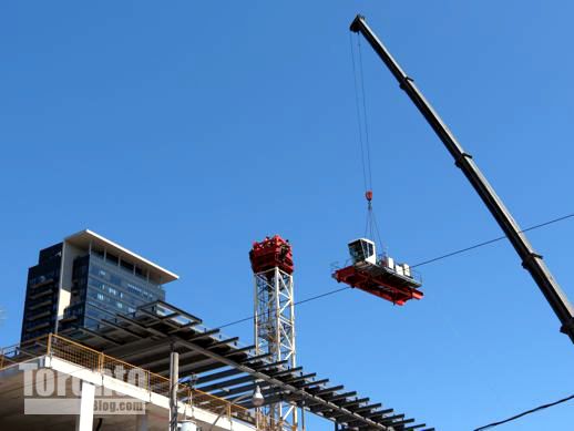 April 29 2012: A view of crane removal activity at the ETFO building, looking west along Isabella Street