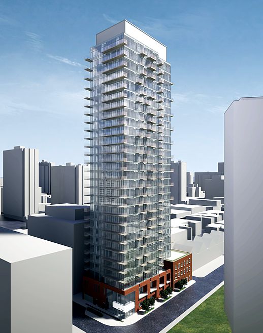 This rendering, provided courtesy of Core Architects Inc., depicts a street view of Nicholas Residences from the northwest …
