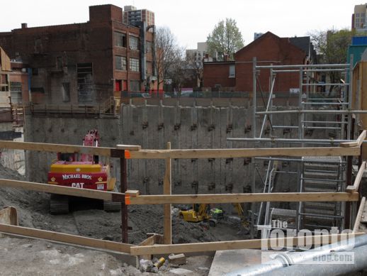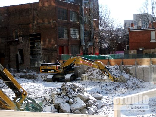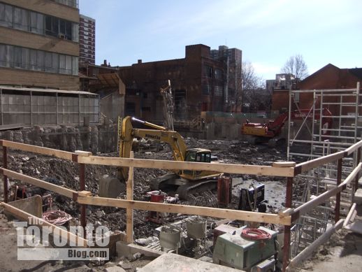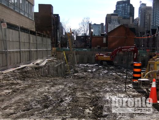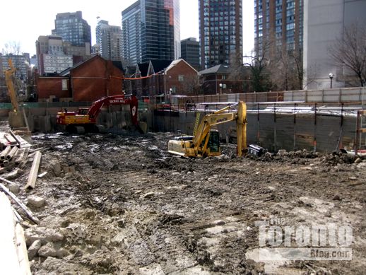 As 2011 drew to a close, drilling rigs were still readying the Nicholas Residences site at St Mary & St Nicholas Streets for excavation. Early in the New Year, digging got underway in earnest at the northwest and southeast corners of the irregularly-shaped property that tucks behind the Church of Scientology of Toronto building and some of its low-rise retail and restaurant neighbours along Yonge Street.