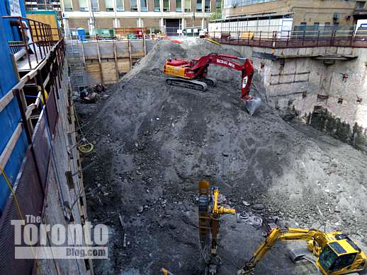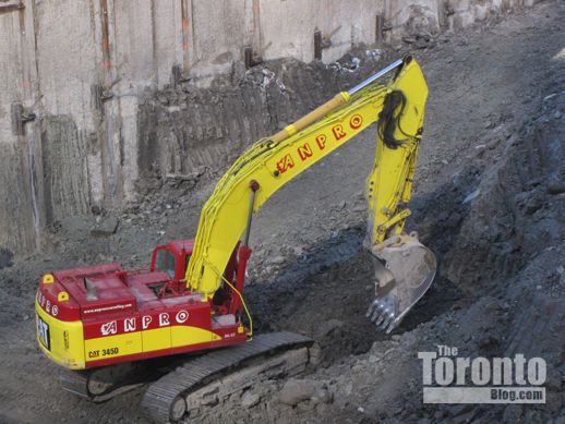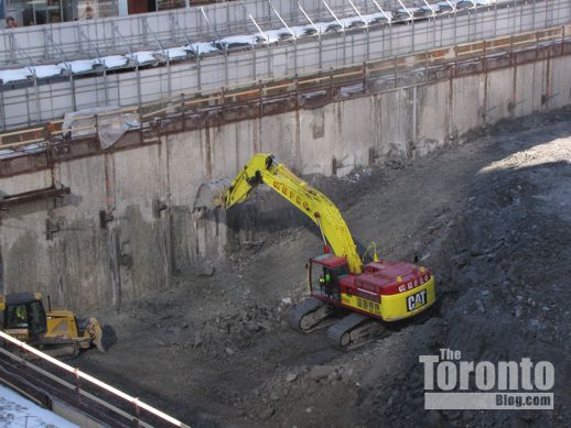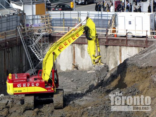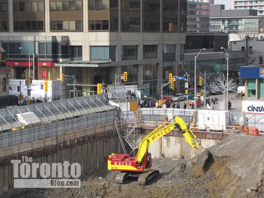 March 2 2012: The busy Yonge & Bloor intersection is only a few meters away from the CAT 3450 digging out the old ramp
