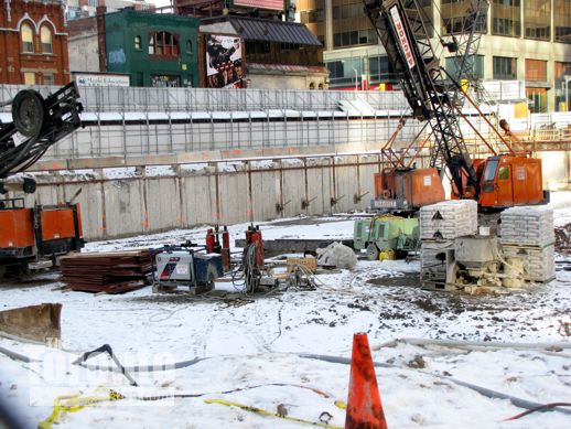 February 12 2012: Looking north across the site. The east sidewalk along St Nicholas Street, left, has been closed to pedestrians during construction.