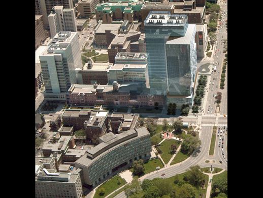 This illustration, also from the Trillium Architectural Products website, depicts another aerial view of the MaRS Discovery District along College Street