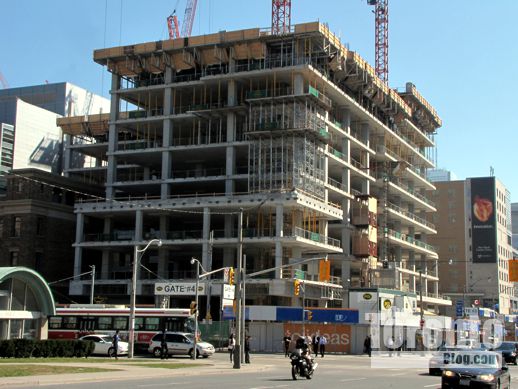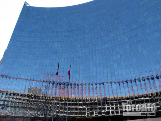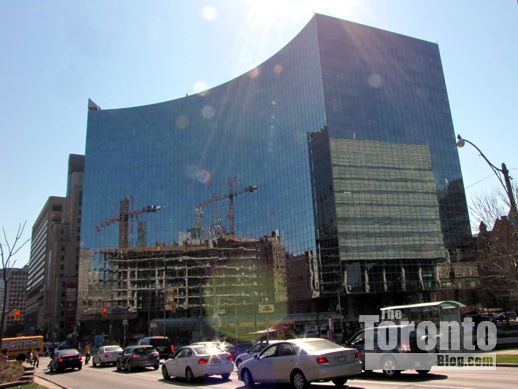 March 20 2012: Besides the MaRS tower, the OPG building’s glass facade also reflects the top of the 50-storey Burano condominium tower under construction a few blocks to the northeast, at Bay and Grosvenor Streets