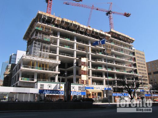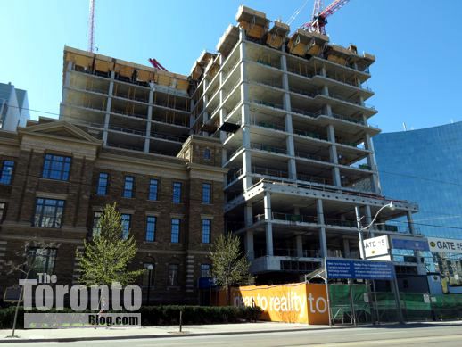 … while this shot, from Sunday morning, shows the Phase 2 tower continuing its ascent above the west end of the brick heritage building