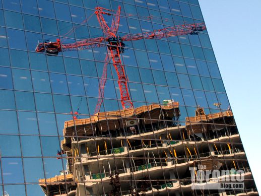 March 20 2012: From this angle, the OPG headquarters reflects two of the cranes on the MaRS project, along with wonky images of condo towers on Bay Street between Grosvenor and Gerrard Streets