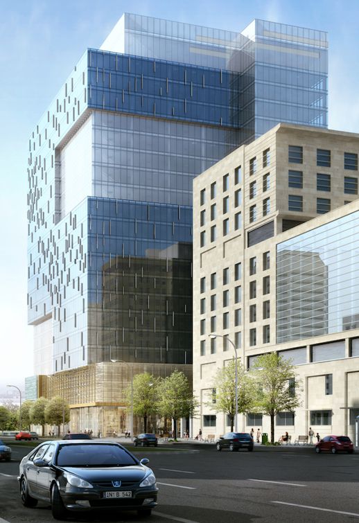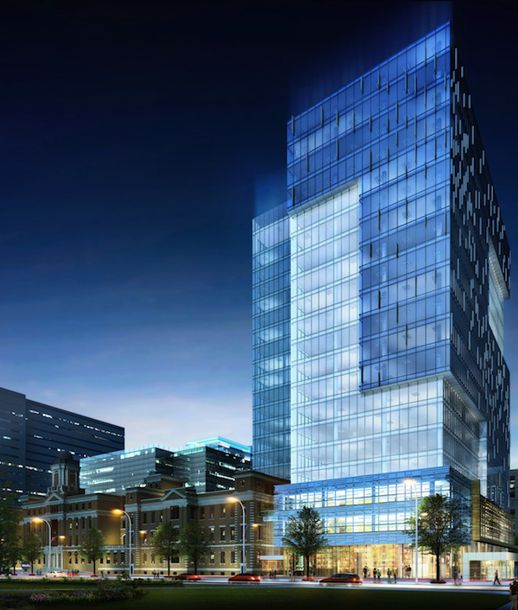 This rendering from the MaRS Centre Phase 2 website shows how the tower will appear next to the historic Toronto General Hospital building facade on College Street that was restored and incorporated into the MaRS complex …