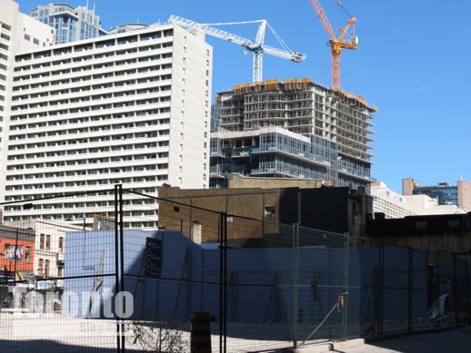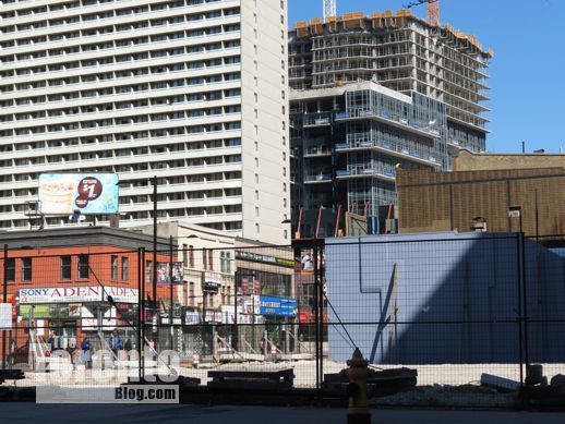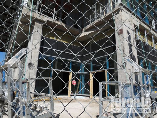 April 29 2012: Looking through the security fence at the Yonge Street length of the Aura podium