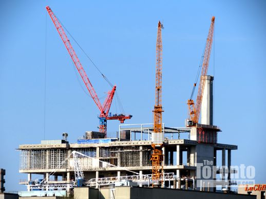 April 25 2012: Aura’s two construction cranes recently rose into my view of the top of the SickKids Centre for Research and Learning tower on Bay Street. The orange crane in the centre of the photo, and the white crane at lower left, are both on Aura. In a few months, Aura will block my sightline to the SickKids tower.