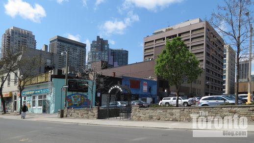 April 27 2012: Buildings along Yonge Street, on the west side of the Wellesley Development Lands, include shops, restaurants, offices and condos