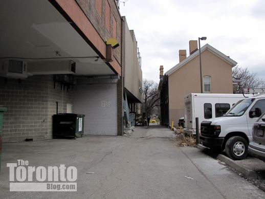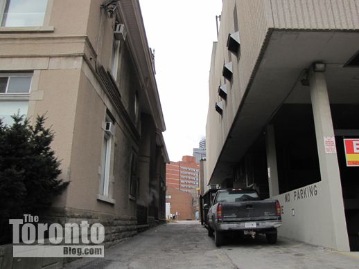 February 28 2012: Looking east from Mutual Street along the McClear Place laneway. The developer proposes to widen this lane by about 1.5 meters to allow vehicular and service access to the condo site, which will occupy what is now a surface parking lot. But planners say the lane is private property.