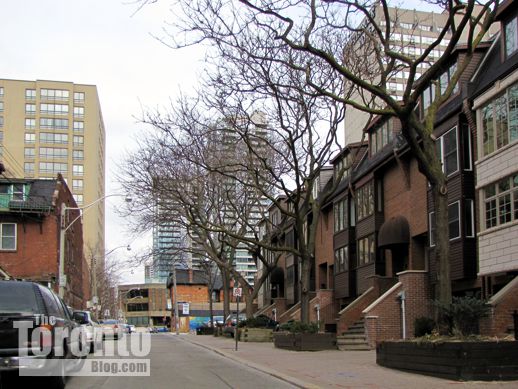 February 28 2012: Looking north on Mutual Street toward the proposed condo development site. Five townhouses would be built at the end of the row of 4-level townhomes shown at right; the 41-storey tower would rise behind them. City planners say the proposal creates “unsupportable shadow and overlook issues” and does not “transition to the neighbourhood designation” for the McGill-Granby area immediately to the west of the site.