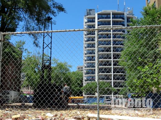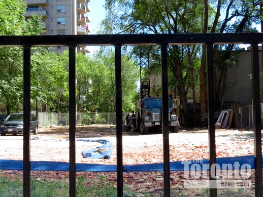 June 13 2012: Looking toward the drilling rig through a wrought iron fence along Wellesley Street — the only Odette House structure that wasn’t demolished in January