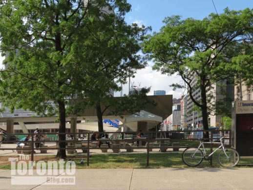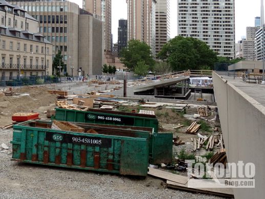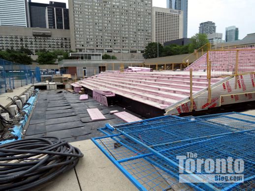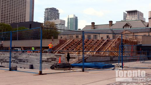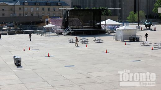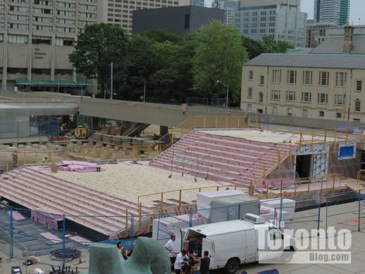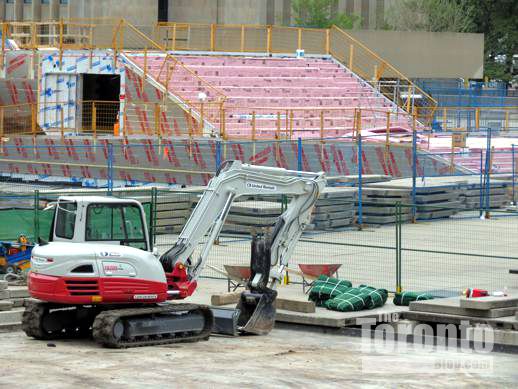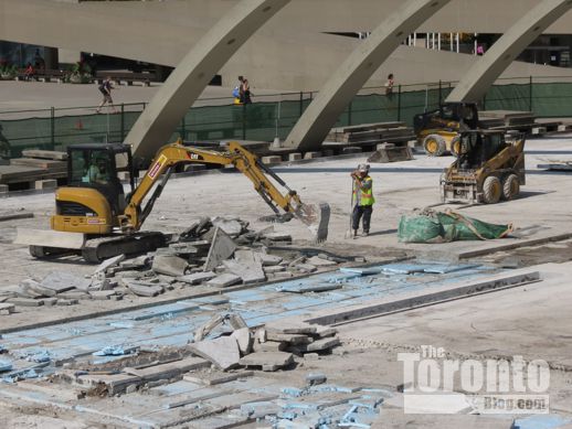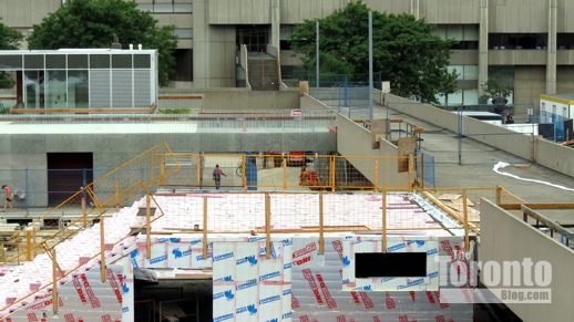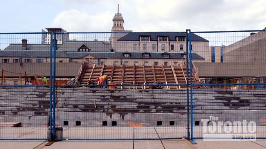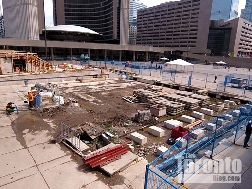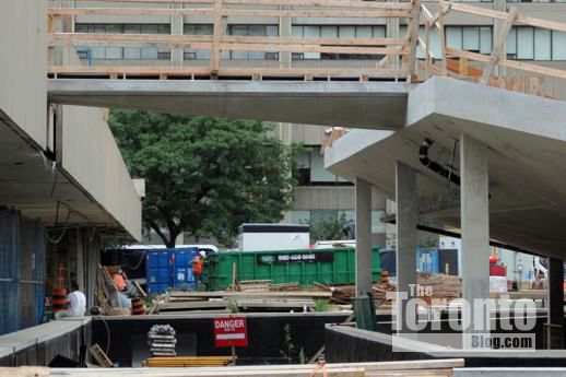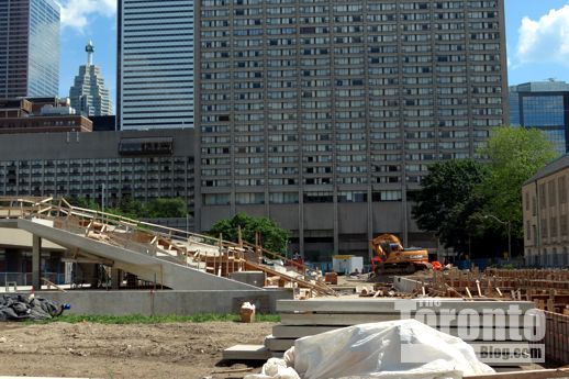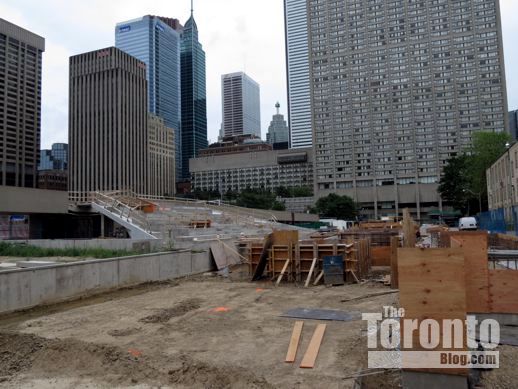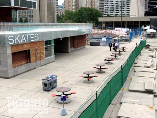 July 19 2012: The square’s picnic tables now offer a close-up view of a common downtown Toronto sight: construction work