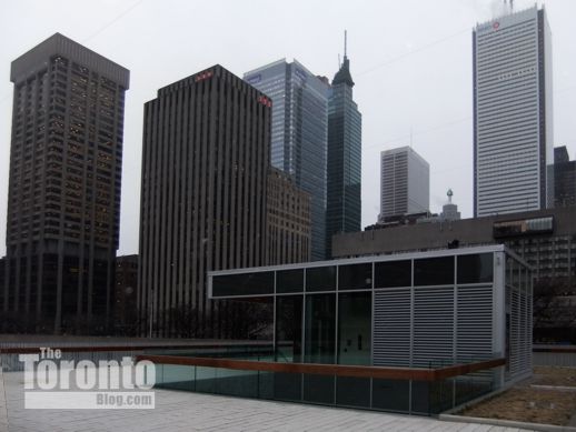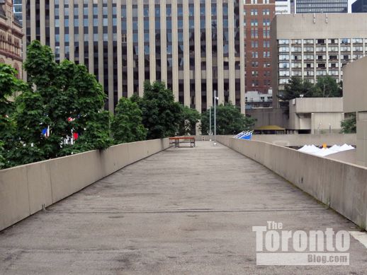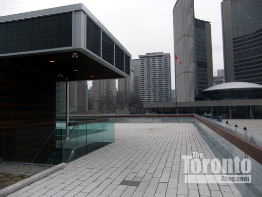 July 27 2012: The Queen Street pedestrian entrance to the square is dominated by the ugly bunker-like entrance to the underground parking lot. The concrete structure was supposed to be replaced …