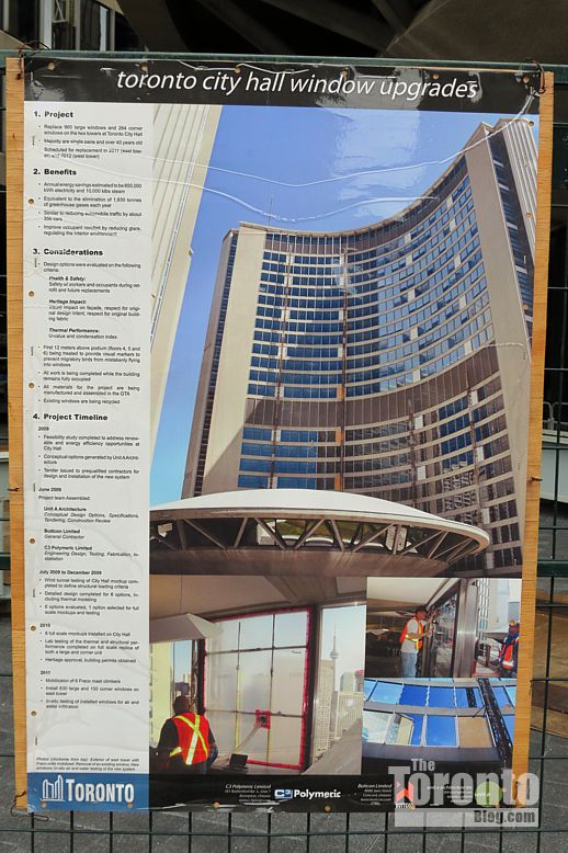 July 7 2012: This poster explains the project schedule for replacing 960 large windows and 264 corner windows in the two City Hall towers