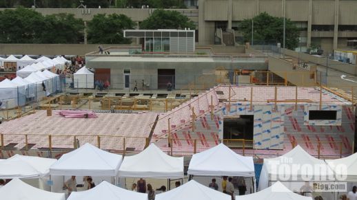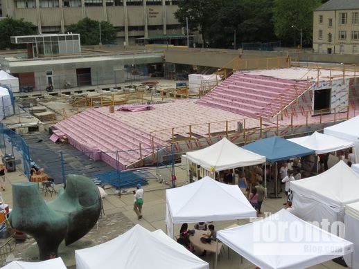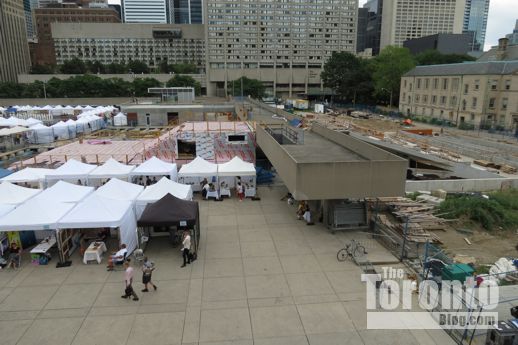 July 7 2012: City Hall podium view of the Peace Garden area, right, and the new theatre stage, center. The white tents in the square are part of the 2012 Toronto Outdoor Art Exhibition that took place July 6, 7 and 8.