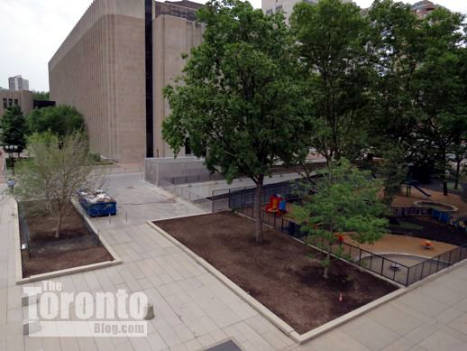 July 19 2012: Four new trees have been added to the “urban forest” in the northwest corner of the square. The equipment in the children’s playground is being replaced this year.