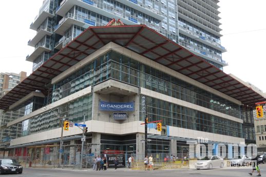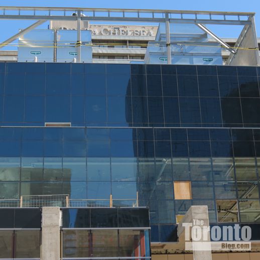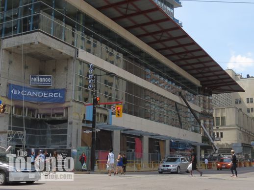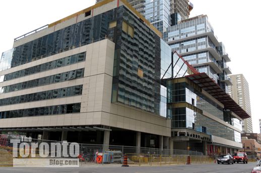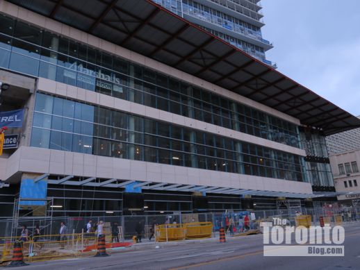 July 7 201: Podium view from the intersection of Yonge & Gerrard Streets. The Marshalls sign is visible in the windows on the podium’s upper level