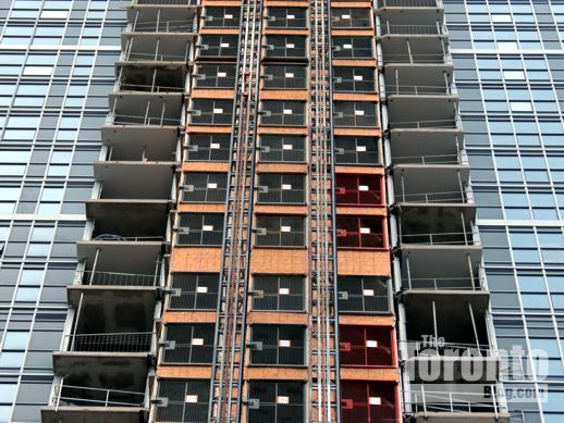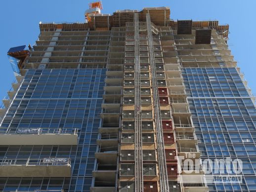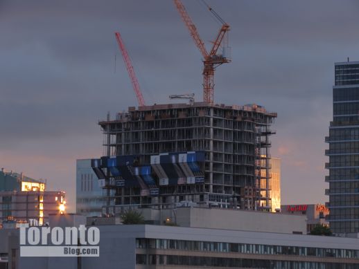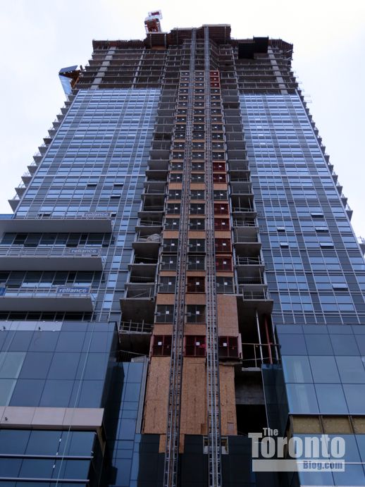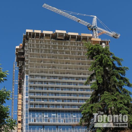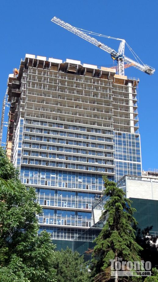 July 31 2012: My window view of Aura. The concrete structure at the bottom of the photo is the roof of the 20-storey Lexington condominium building at 45 Carlton Street.