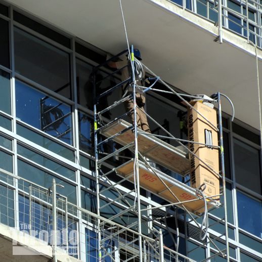 August 13 2012: A construction worker removes safety fencing from the top of another building form