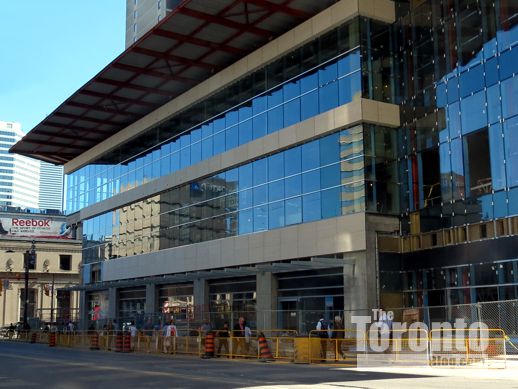 June 8 2012: The American retail chains Bed Bath & Beyond and Marshalls will be opening stores on the podium’s upper levels. Signs for Bed Bath & Beyond are visible in the windows.