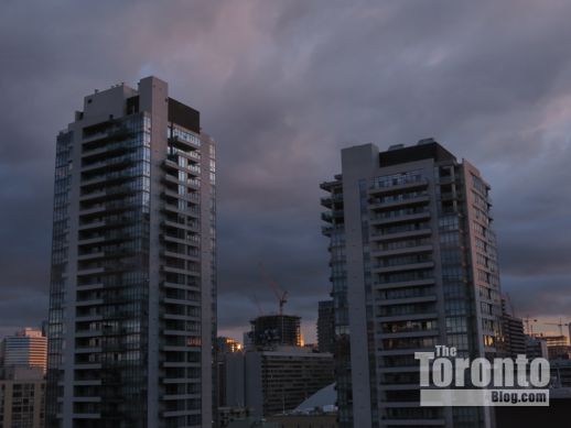 August 12 2012: A view of Aura as the sunset casts its glow on a Bay Street condo highrise, left, and the SickKids Centre for Research and Learning, on the right side of Aura.