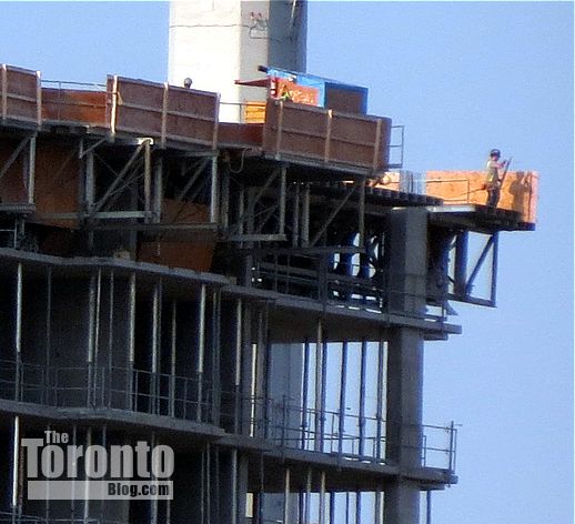 August 13 201: Two construction workers guide the rear end of the form as the crane pulls the structure away from the building