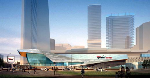 This rendering provided to the media shows how the distinctive roof will appear when viewed from the entrance plaza to Ripley’s Aquarium of Canada