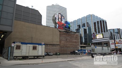 This empty lot on the south side of Gould Street, formerly the site of the historic Empress Hotel building, is currently being used as a construction staging area for the Student Learning Centre work crews. The 123-year-old Empress Hotel building burned down on January 3 2011. On July 13 of this year, police laid arson-related charges against 53-year-old Stewart Poirier in connection with the incident. The property owner has not yet announced any plans to redevelop the site. A July 31 2012 story in the Toronto Star provides full details about the charges, and includes a photo showing how the hotel originally looked.