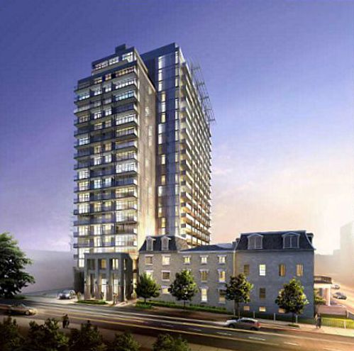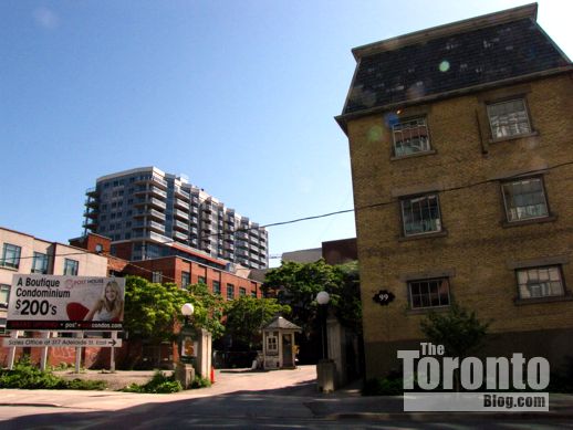 Below is an artistic rendering of the building that appears on the Post House Condos website, along with several pics showing the condo site and the heritage buildings to its south. There’s also a couple more pics of today’s crane installation.