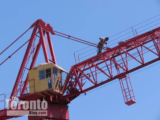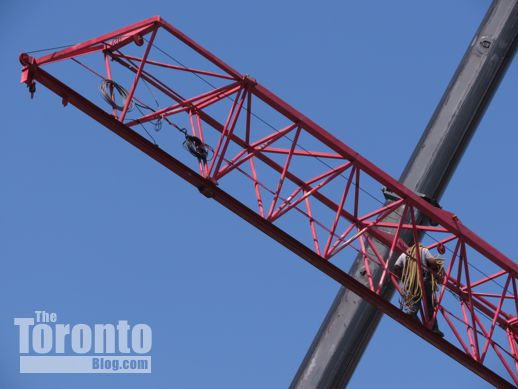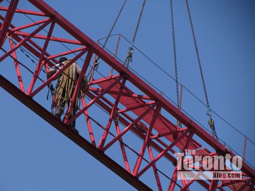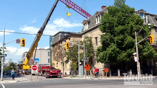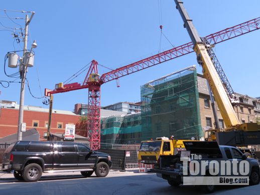 August 22 2012: A view of the crane being installed behind the Bank of Upper Canada building at the northeast corner of Adelaide and George Streets
