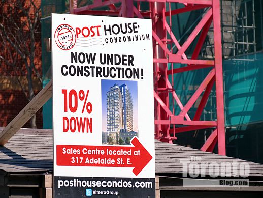 August 22 2012: A Post House Condos marketing sign near the newly-installed crane