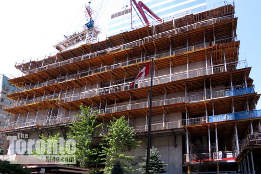 Below is an artistic rendering, from the Zeidler Partnership Architects website, showing how the heritage facade will appear on the tower base. That is followed by photos I’ve taken showing construction progress on the building during July and August of this year.