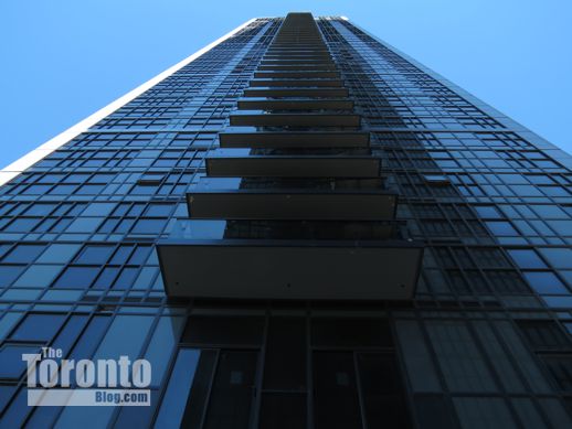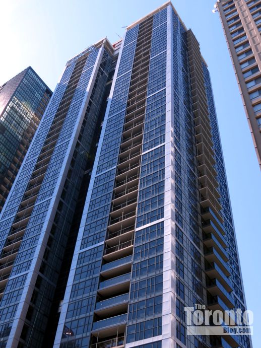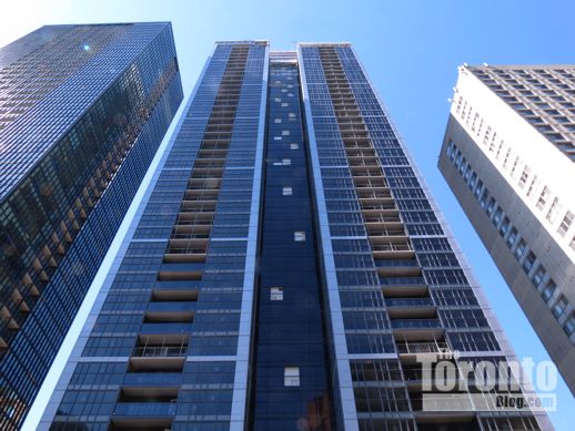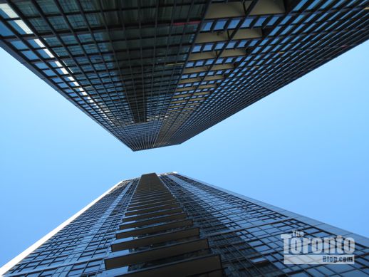 September 1 2012: Looking up the south side of Couture Condominium, bottom, and the north side of its next-door neighbour, X Condos, top