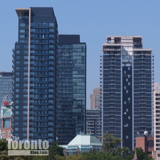 August 22 2012: Couture Condominium (right) viewed from the east. Its highrise neighbours include the James Cooper Mansion condo tower on Sherbourne Street, left, and the X Condos tower at Jarvis & Charles Streets, center.